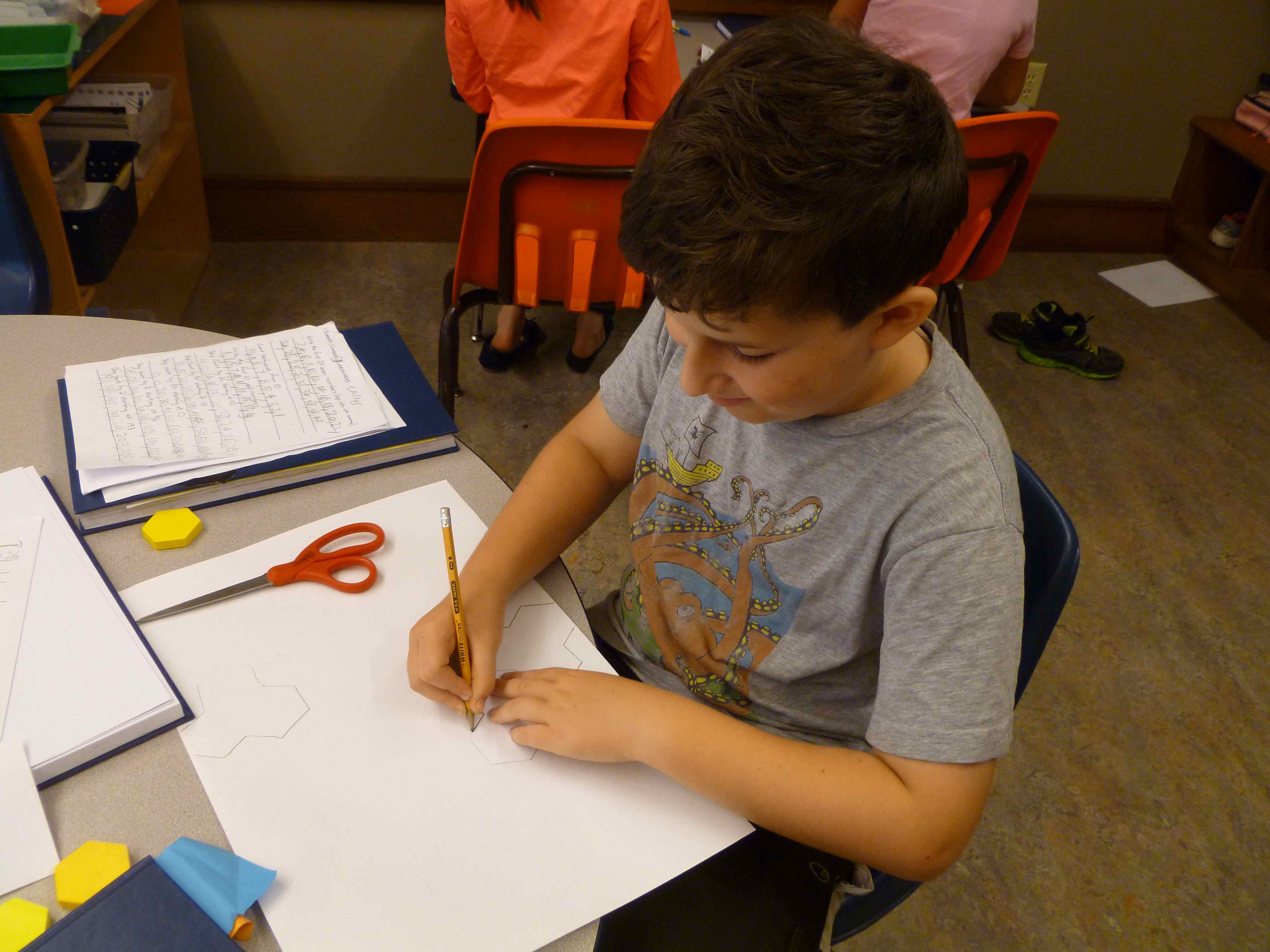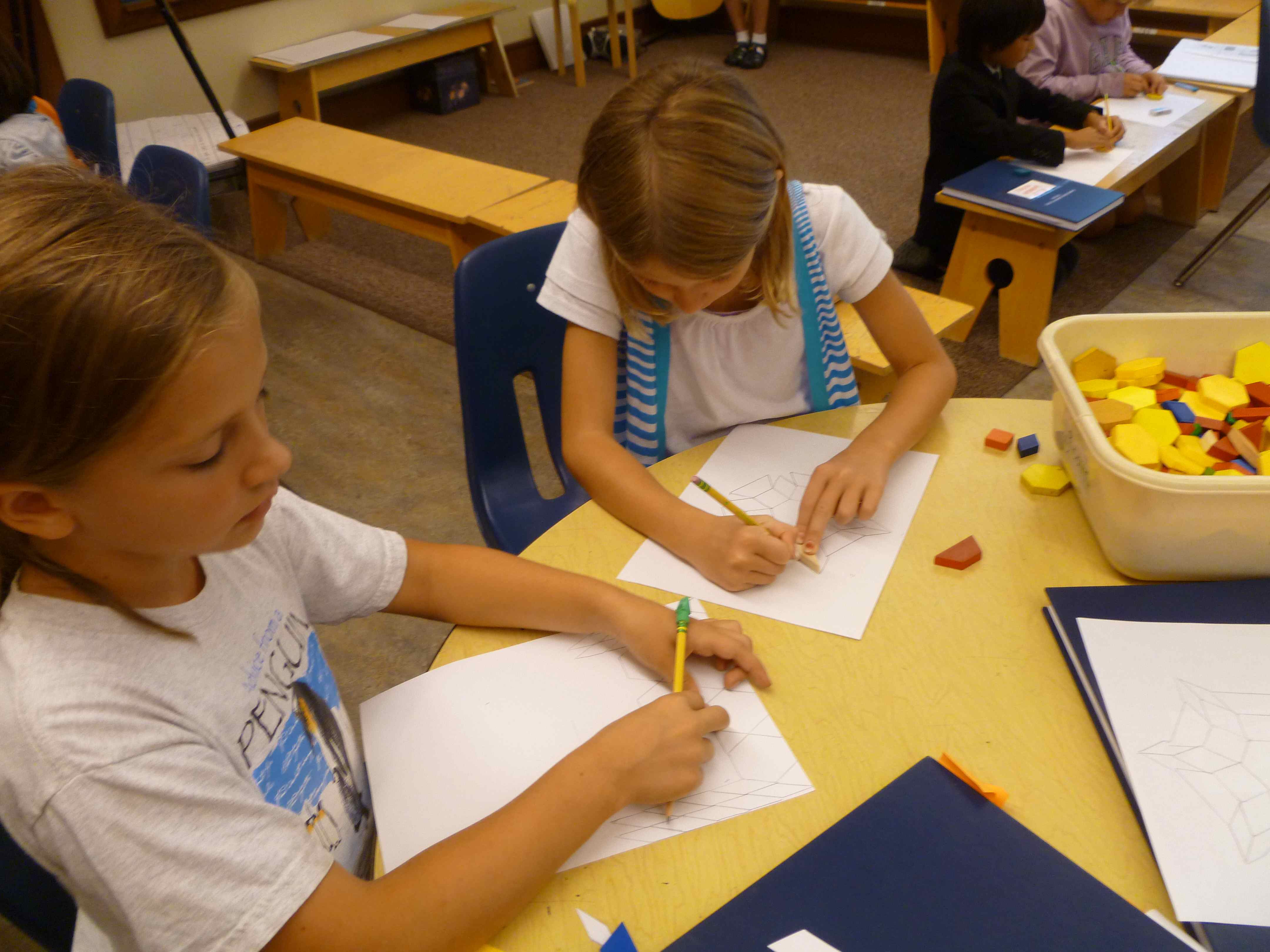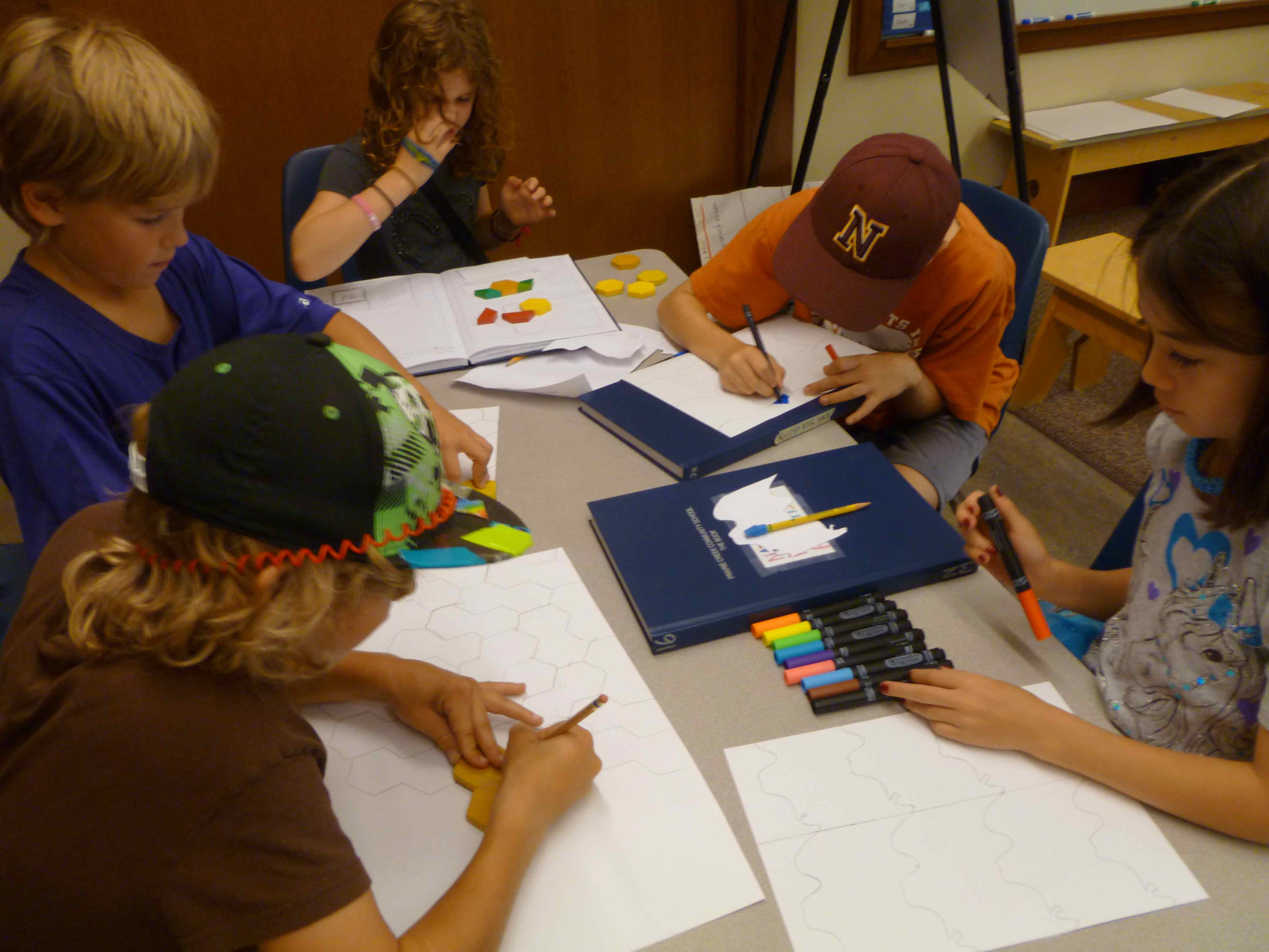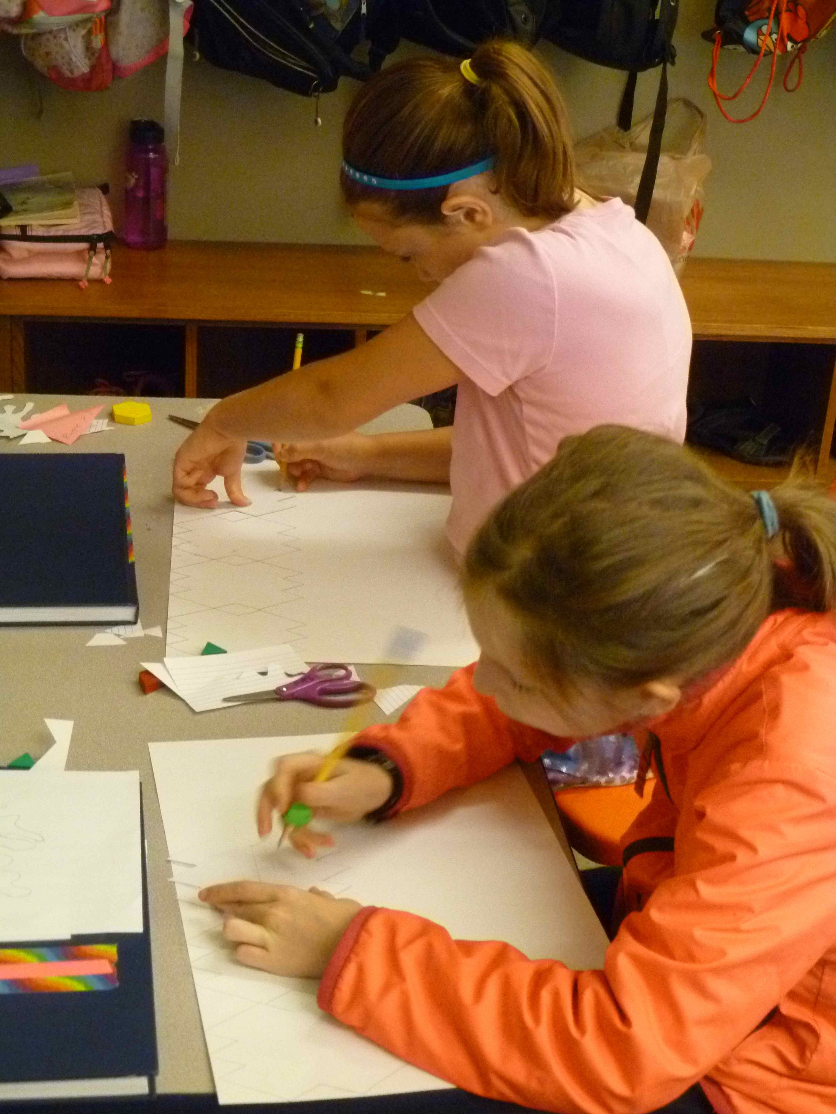 The 4/5 classess have begun our regular math routine. We spend 15 minutes in foundation math, reviewing and learning the basic skills necessary to solve problems in math. The rest of our time, about 55 minutes, is spent in exploration math. In our first exploration math unit, we are studying geometry. We have mixed the students into three groups that have kids from each class, and those groups will do three, three-day rotations among the three teachers. Gabe is teaching about polygons, Michelle is teaching angles through an online LOGO programming activity, and I am teaching a variety of geometry vocabulary (congruent, similar, symmetry, reflection, rotation, translation, and tessellation). My rotation includes a math art project in which students create a shape that tessellates and then cover a paper with their shape. Here are some photos of my first group working on their tessellation art. CTO