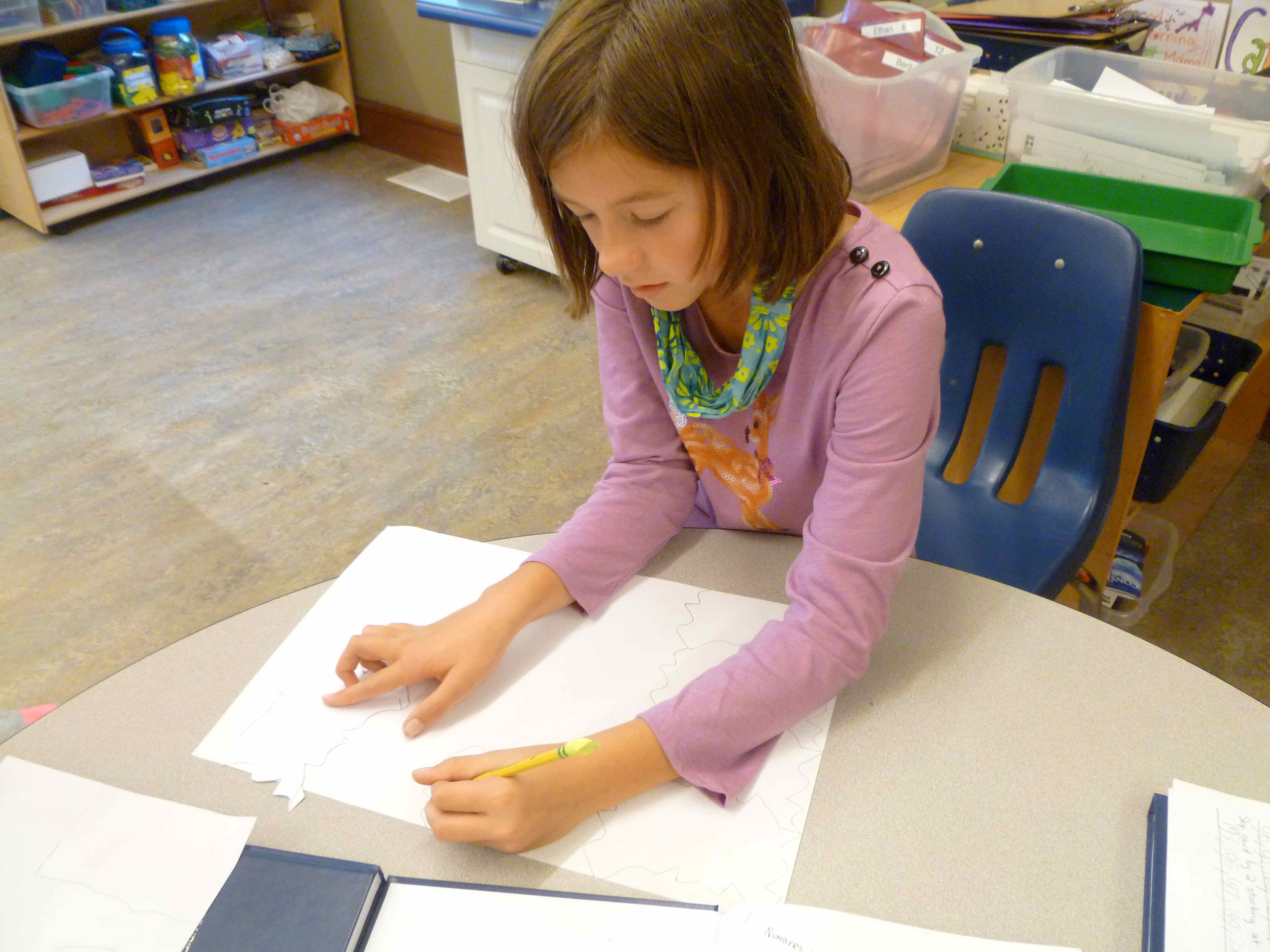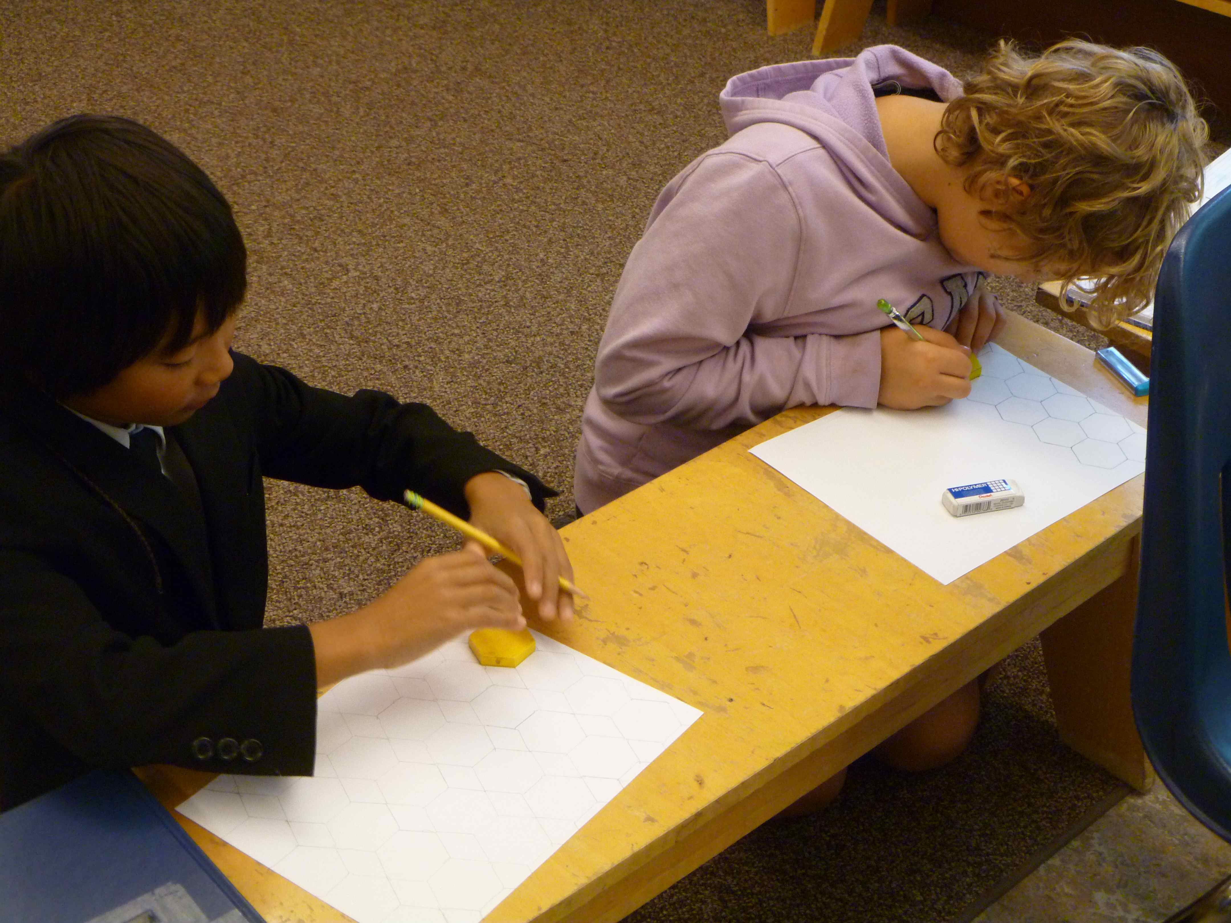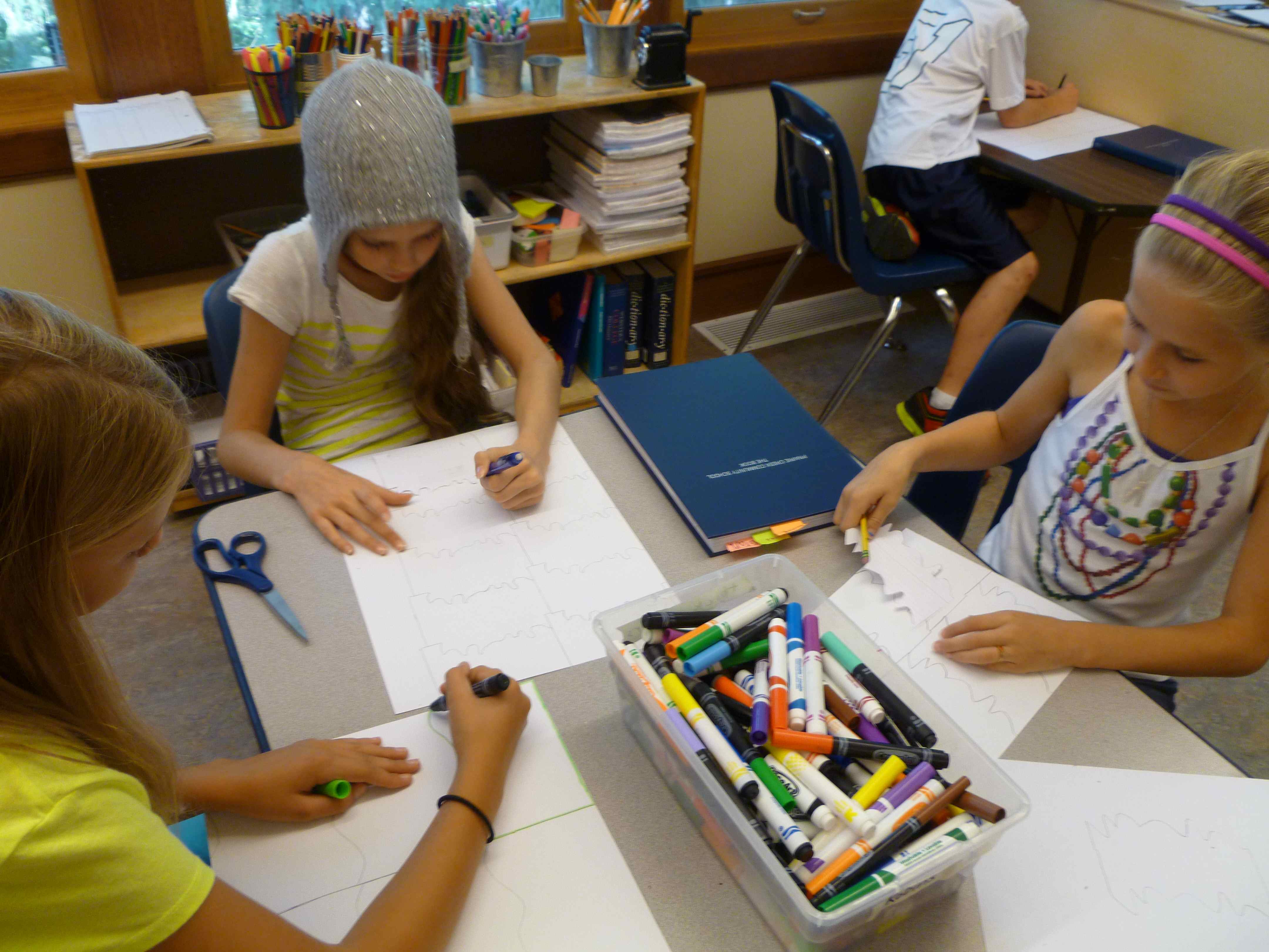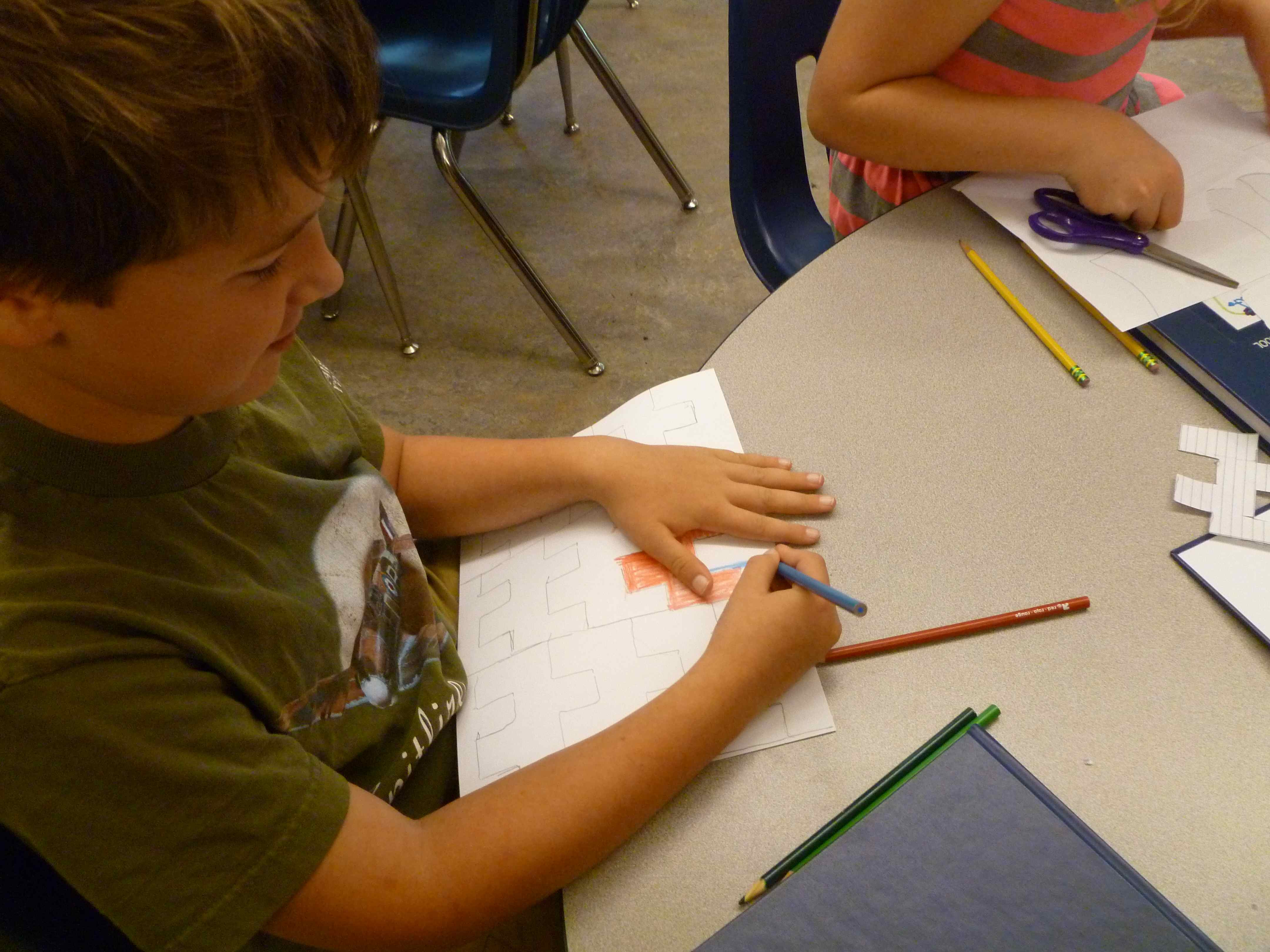 The 4/5 classess have begun our regular math routine. We spend 15 minutes in foundation math, reviewing and learning the basic skills necessary to solve problems in math. The rest of our time, about 55 minutes, is spent in exploration math. In our first exploration math unit, we are studying geometry. We have mixed the students into three groups that have kids from each class, and those groups will do three, three-day rotations among the three teachers. Gabe is teaching about polygons, Michelle is teaching angles through an online LOGO programming activity, and I am teaching a variety of geometry vocabulary (congruent, similar, symmetry, reflection, rotation, translation, and tessellation). My rotation includes a math art project in which students create a shape that tessellates and then cover a paper with their shape. Here are some photos of my first group working on their tessellation art. CTO